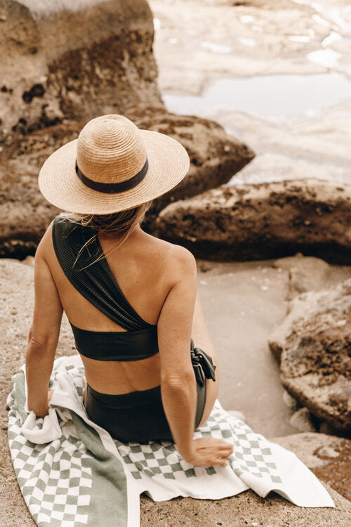 Featuring a side strap that can be worn on or above the shoulder. Khaki colour way has no cups. Pair with our Lola or Grecian full coverage bottoms. Both styles have support bands with the option to be worn high waisted or folded over for a lower fit.